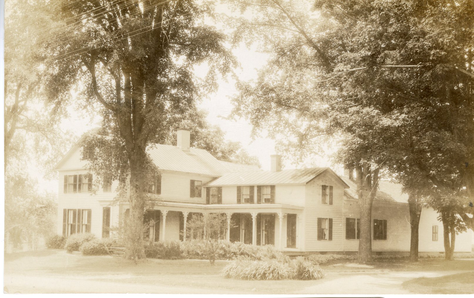 The Hewitt House in Worthington Center at crossroads of Route 112 and Sam Hill Road. Black and white photograph shows dirt road and hydrangea bush. Tree at left of photo obscures the front porch. Now 4 Sam Hill Road. Previous owner Donald Newton, current owners: Diane Brenner/Jan Roby.