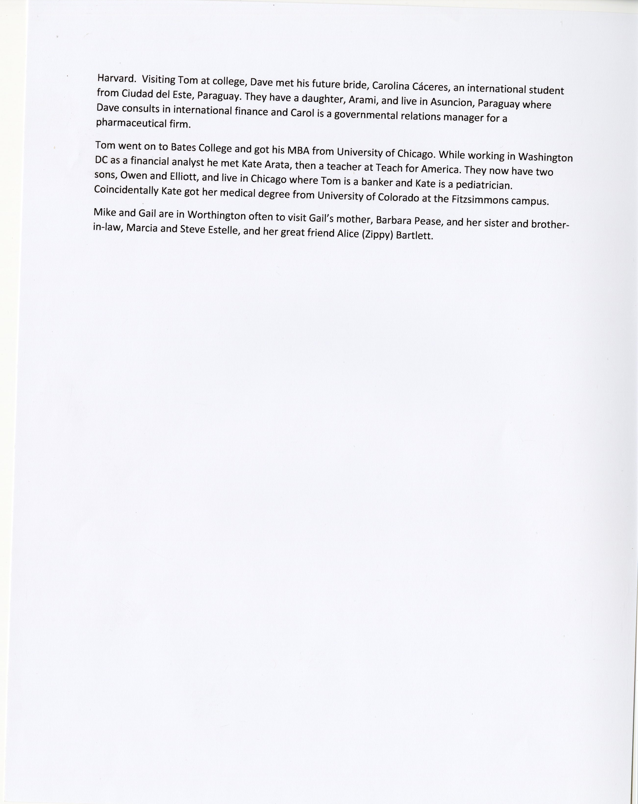 Biographical sketch of the Lucey family of Ring Road. Mentioned are Robert J. (Bob) Lucey (1911-1983). Gertrude (Gert) Lucey (1908-2006). Also mentioned are sons, Robert F. Lucey (spouse Claire) and Michael Lucey and townsfol: Ida Joslyn, Barbara Dunlevy, Winnie Nugent, Gary Granger, Lyndon Brown, Darryl Smith, Wells Magargal, Paul Bartlett, Paul Dunlevy, Gary Pease, Bernie Yvonne. Gail Pease; various grandchildren and great grandchildren are named as well.