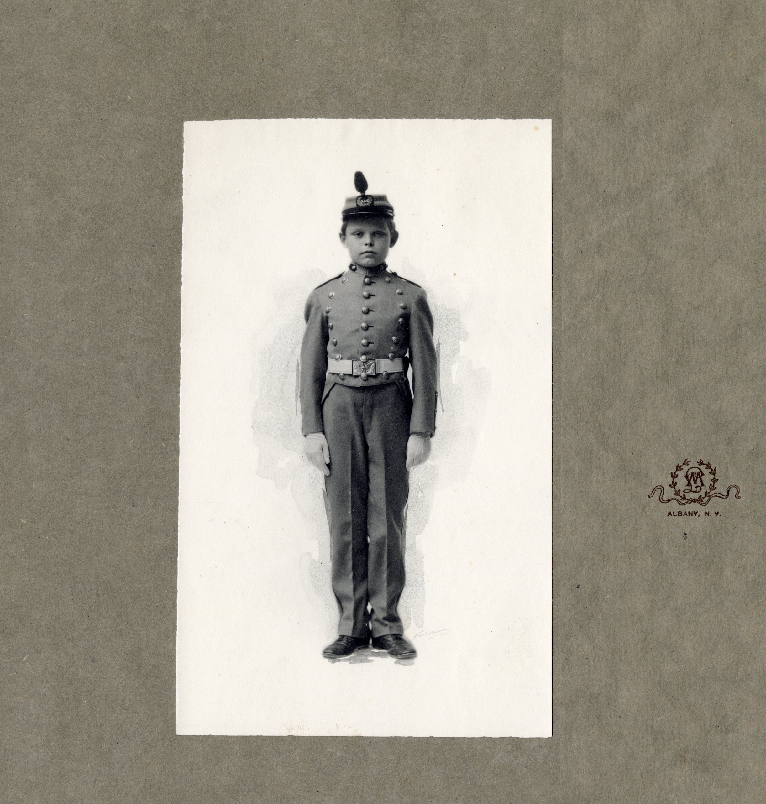 Black and white glass negative photograph of William G. Rice Jr, seated in upholestered wing chair. Titled 'Taking a nap', no date. Note accompanying box of photos says: Pictures printed by Mr. Arthur Tuttle from old glass negatives taken by Mrs. Wm. G. Rice, 1890-1910. These seem to be the actual negatives. PGRice Jr. in cadet uniform.