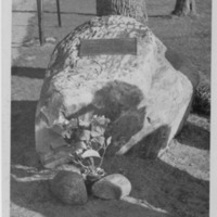 Sepia tone photograph of Burr memorial boulder at Witt Hill and Huntington Roads. Apparently the letters were stolen at one point.
