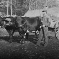 Henry Tower with Wagon and Oxen. Many of these dryplate glass negatives are in The South Worthington Parish Book by Reverend George Reed Moody. Please see this book for further information. They were originally entered into the database with little identification. The photographs were taken between 1882 and 1907 by the Howes Brothers of Ashfield. The origin and purpose of the number often written on the binding tape of these dryplates are presently unknown. The slides were cleaned and catalogued by Marion Sweeney between 1982 and 1986.