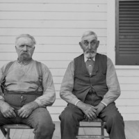 Mr. Wood and Mr. Isaac Percival Sitting on a Porch. A photograph from this dryplate glass negative is in The South Worthington Parish Book by Reverend George Reed Moody. (Plate Xlll, no. 24 and 25). Please see this book for further information. They were originally entered into the database with little identification. The photographs were taken between 1882 and 1907 by the Howes Brothers of Ashfield. The origin and purpose of the number often written on the binding tape of these dryplates are presently unknown. The slides were cleaned and catalogued by Marion Sweeney between 1982 and 1986.