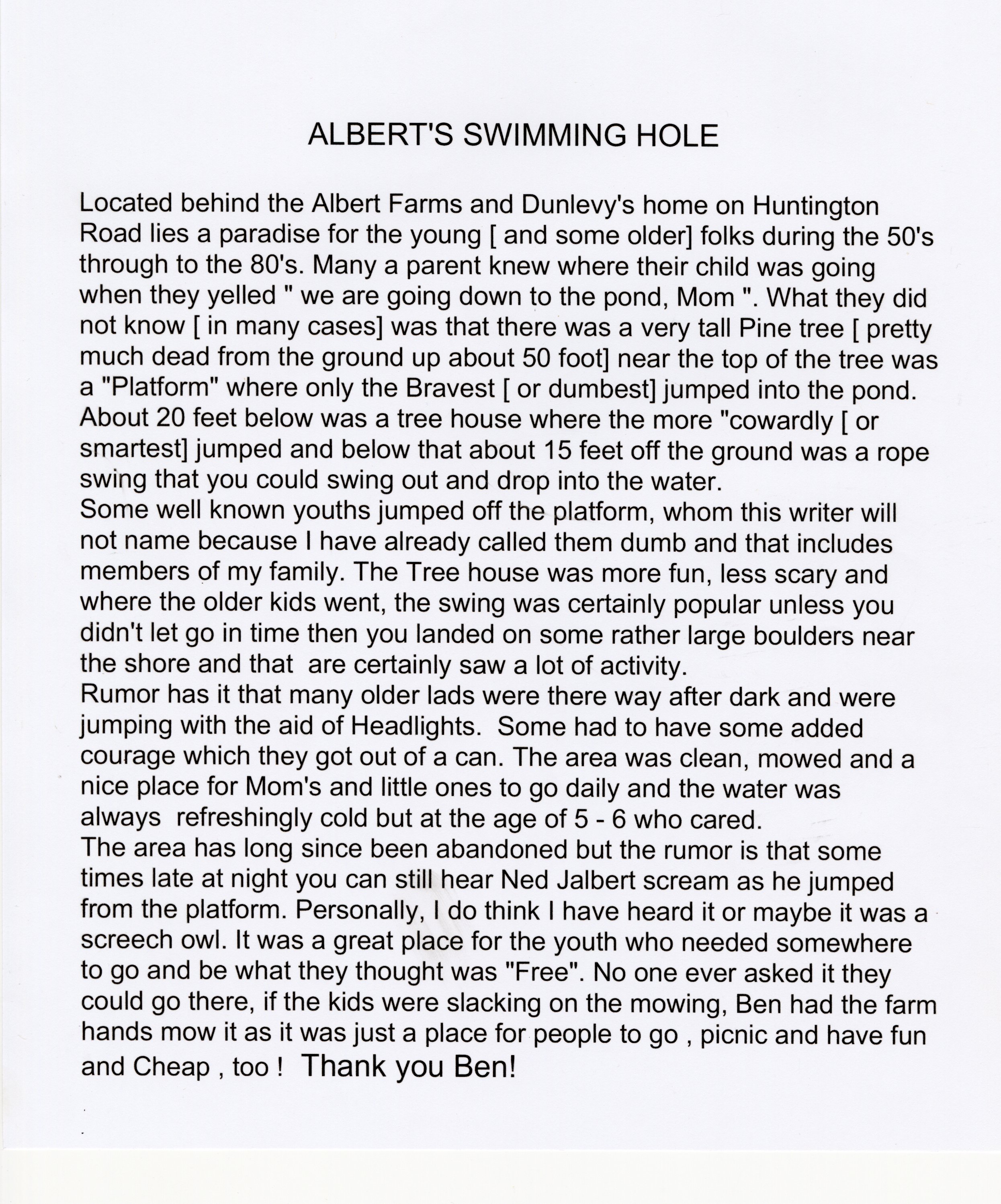 Black and white photo of hemlock tree with diving platforms and climbing rope at pond at Albert's farm plus article for the Worthington 250th anniversary