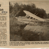 Newspaper account of the crash of a Cessna 175 single engine airplane on the Albert field along the Old Post Road. No injuries. Pilot unnamed. Selectman/Police Chief Tyler mentioned in article