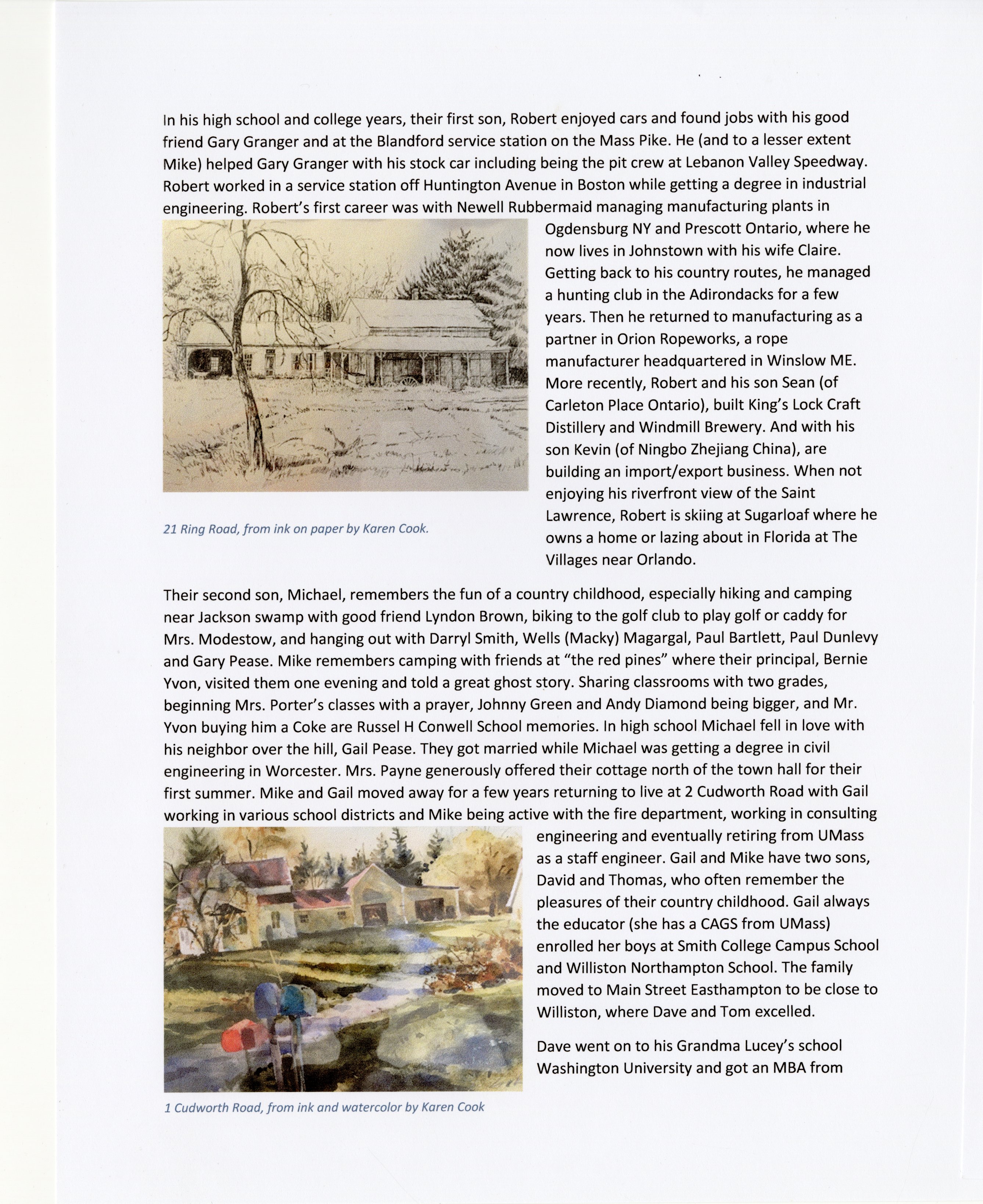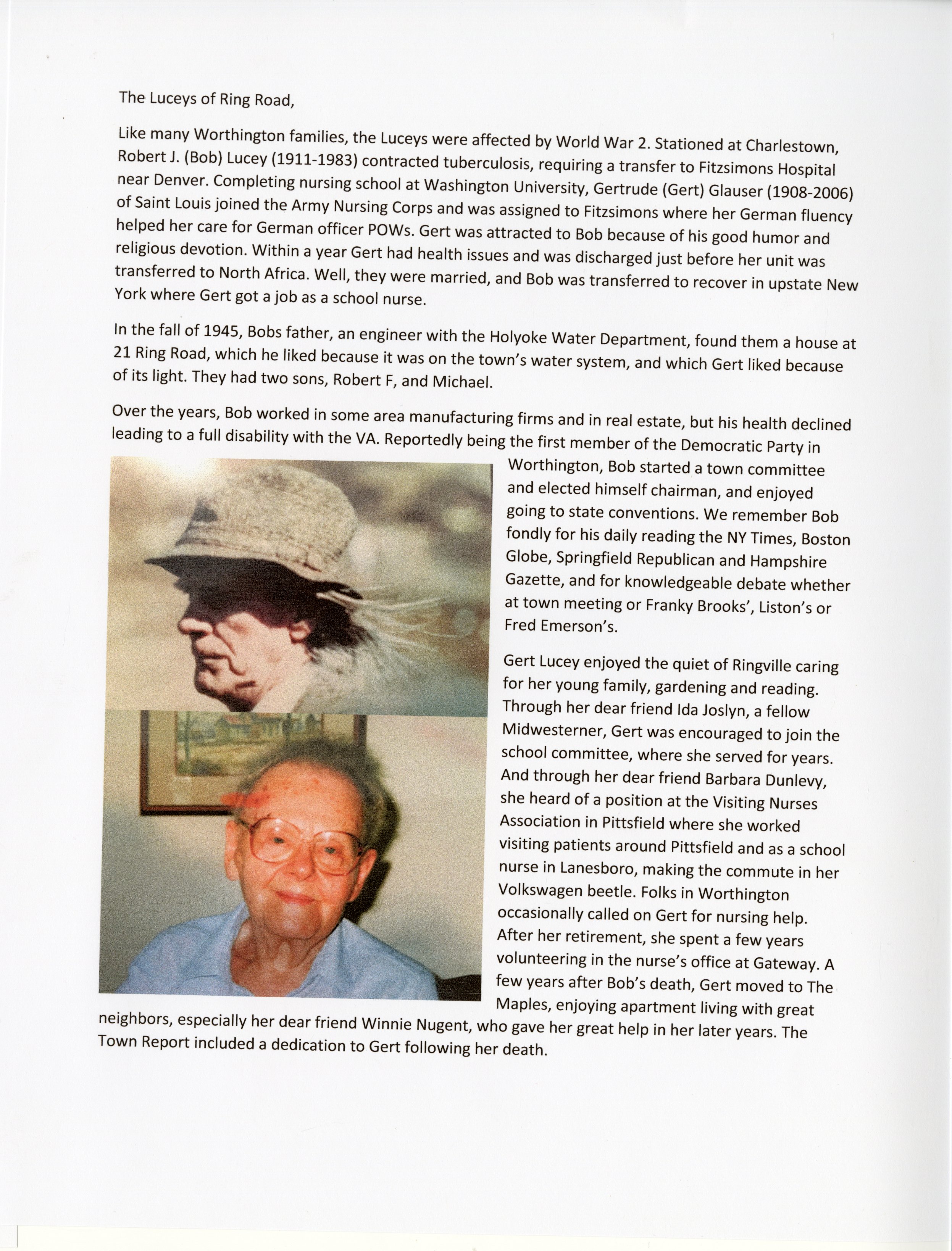 Biographical sketch of the Lucey family of Ring Road. Mentioned are Robert J. (Bob) Lucey (1911-1983). Gertrude (Gert) Lucey (1908-2006). Also mentioned are sons, Robert F. Lucey (spouse Claire) and Michael Lucey and townsfol: Ida Joslyn, Barbara Dunlevy, Winnie Nugent, Gary Granger, Lyndon Brown, Darryl Smith, Wells Magargal, Paul Bartlett, Paul Dunlevy, Gary Pease, Bernie Yvonne. Gail Pease; various grandchildren and great grandchildren are named as well.