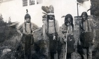 1925 centennial celebration of Lafayette's visit. Sepia photograph from Elsie Venner Bartlett scrapbook (died 1952), showing four young men in indian costumes and makeup standing in front of library.