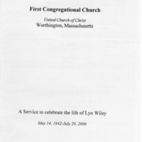Program booklet to celebrate life of Lyn Wiley (May 14, 1942-July 29, 2006). Lyn was a remarkable woman who suffered from cancer for twenty years but gave of her energy wherever she could. She wrote these words before she died: "When I die I will not be floating with the clouds and I will not be with a man/woman with God and angels with wings. I was born from the love of my mother and father and they from theirs. What is me is energy, energy that will leave my body on death and continue through you, whom I have loved with my energy and those who have loved me. Let your sadness be limited and know it is now better for my mortal body........" She was also the leader of the Worthington Bells at Church after the death of Michael A. McAnulty.