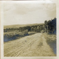 Sepia snapshot showing Chesterfield Road (Rte 143 S), dirt road with ruts and wheel tracks, looking towards Chesterfield. Small nick in upper part of snapshot.