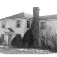 Fairly dark black and white photo taken in winter of the Bower/Albert/Modestow House. Originally constructed by C. Reed to house hotel employees. Monroe Todd (Chesterfield) built chimney.