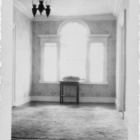 Jonathan Woodbridge House - View of interior, upper front hall. Shows Palladian window and chandelier and wallpaper, rugs before restoration. Owned at that time by Jay and Isabel Gangel. Helen Sharron Pollard and Jill Gangel, their grand daughter, played with Barbies in this front hall in the 1960s. Black and white photograph. See photos: Ph102af, Ph102ah, Ph121pc, Ph122pc