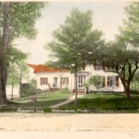 Frissel's Inn, Worthington, MA' The number '77' appears on the photo. Color tinted photograph. 'Thrasher' appears on the matte board. This is south of Sheldon Crocker's house (Herb Porter's former house). Barn built by Irving L. Bartlett ca 1900. (identify Ted Porter)