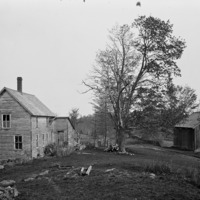 Unidentified House and Barn. Many of these dryplate glass negative photographs are in The South Worthington Parish Book by Reverend George Reed Moody. Please see this book for further information. They were originally entered into the database with little identification. The photographs were taken between 1882 and 1907 by the Howes Brothers of Ashfield. The origin and purpose of the number often written on the binding tape of these dryplates are presently unknown. The slides were cleaned and catalogued by Marion Sweeney between 1982 and 1986.