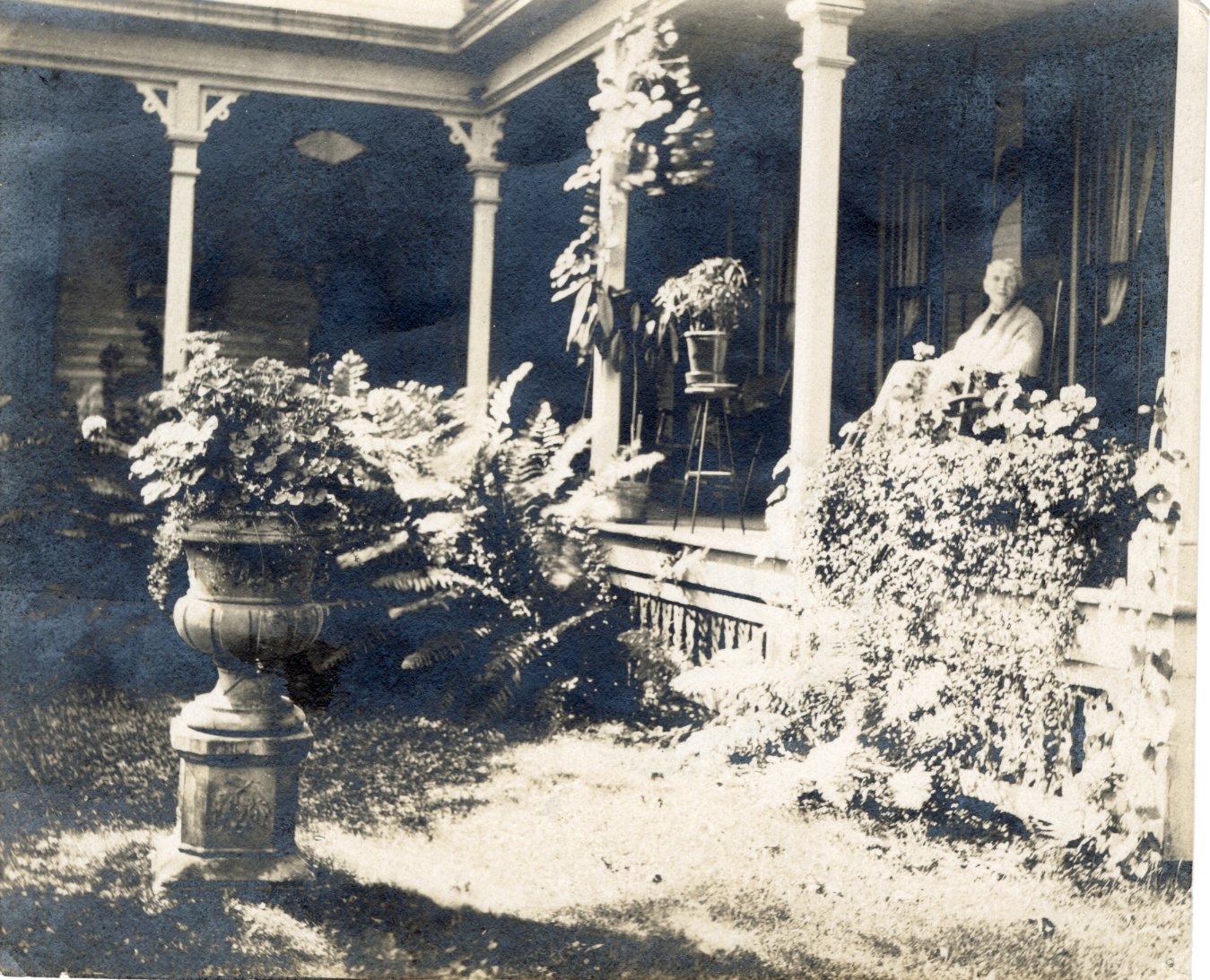 The Hewitt House in Worthington Center at crossroads of Route 112 and Sam Hill Road. Black and white photograph shows dirt road and hydrangea bush. Tree at left of photo obscures the front porch. Now 4 Sam Hill Road. Previous owner Donald Newton, current owners: Diane Brenner/Jan Roby.