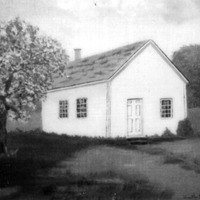 This polaroid shows the painting of the Capen Riverside School, painted by Walter Tower (father of Dorothy T. Beebe), before it was donated to the Worthington Historical Society. In the photo, the painting, which is hanging on a paneled wall, most likely is in the house of Dorothy Beebe. Presently, it is hanging in the East Vestibule of the Worthington Historical Society Building. On the back is written: this is a polaroid taken from a painting years ago as the appletree is in bloom.' refer to PTG1 (on display)