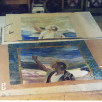 Scrapbook - Photo Book of Memorial Window Picture book of stain glass memorial window in memory of Rev. Frederick Sargent Huntington: "The photos in this book show views of the window from the north wall of the sanctuary of the Worthington Congregational Church. This window was completely disassembled, cleaned, and reassembled using new lead cames, by David Guarducci, and delivered back to the church February 24, 1996. The first photos show cracks in the lead which necessitated the rebuilding. The failure of the lead is simply the result of age, combined with the considerable weight of the glass it supports. Other photos indicate something of the multi-layer construction of the window and of the meticulous steps required in reassembling." Guarducci Stain Glass Studios, Montainview Road, North Egremont, MA 01252. This window is reputed to be of equal status to a Tiffany window. Restoration paid for by Snyder/Rolland Family.