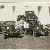 Black and white snapshot original Henry Snyder standing in front of tractor/trailer carrying autos. He is looking very dapper. 'Snyder's Express Trucking' banner on side of trailer. Shows car hauler with many cars on it. One photo taken in Northamption.