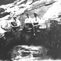 Three Unidentified Men. These are all Glass Slides made by Franklyn Hitchcock, resident of Worthington. The numbers on each slide refer to the numbering system used by Hitchcock. This is 97. The men are seated on a ledge near water. The glass is cracked.