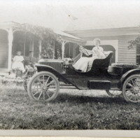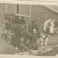 Three black and white photos: two show black cars (Model T), one with woman driver, the other undriven; third photo is of a horse-drawn carriage in front of a barn. Otherwise unidentified.