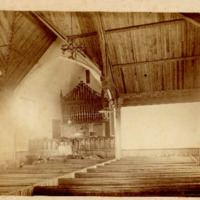 Sepia-toned print of church interior showing organ. Note kerosene lamps. Spot damage.
