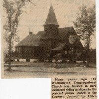 Photo is sepia tone and appears to be cut from a book. Shows early Congregational Church when it was brown. Note sheds on north side. also a newspaper clipping photo and two postcard photos