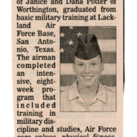 Digital image of newspaper article from the Hampshire Gazette, Feb 2-3, 2013. Shows Chesley Potter, daughter of Janice and Dana Potter, in uniform. She had just graduated from basic military training at Lackland Air Force Base in San Antonio, TX. The original copy no longer exists.