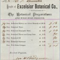 Digital copy of a bill of sale, dated July 28, 1885, listing patent medicines purchased from the Excelsior Botanical Co., manufacturers of The Botanical Preparations and Wild Rose Cologne. The Brewster's General Store was located at the NE corner of Huntington Road (Rte 112) and Harvey Road. Brewster spent $8.01 on various oils and ointments. The bill of sale is signed by J.H. Bridgman, Traveling Salesman.