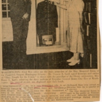 Newspaper article with photograph describing the display in the Rice Memorial Room of the Worthington Library; it shows the uniform of General James Clay Rice, image includes Harry Bates, and Francis A. Lord (historian). Also shown are Rice's swords.