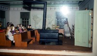 This is one of fifteen photographs of the 1976 renovation of the Capen/Riverside School House. This photograph shows the barrel vaulted ceiling. Color photo scanned as black and white.