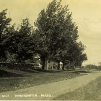 Sepia real photo postcard titled 'A Pleasant Drive Worthington Mass.' made by Thrasher Post Card Co., Mt. Clemens, Mich. and Worthington, Mass. Postally unuhouses on left (three, one with lavish porch, two smaller buildings/houses behind it), dirt road with man walking in distance, numerous narrowly spaced telegraph poles and stone wall with stairs and fence. Location needs to be identified. From a postcard album (since deteriorated) left by Mrs. Josephine (Rice) Creelman.