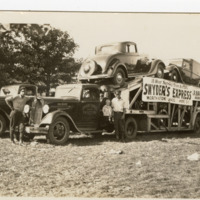 Black and white snapshot original Henry Snyder standing in front of tractor/trailer carrying autos. He is looking very dapper. 'Snyder's Express Trucking' banner on side of trailer. Shows car hauler with many cars on it. One photo taken in Northamption.