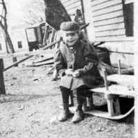 Black and white photograph of a unidentified girl, age 2 or 3, sitting on a wood sled outside of a shed. Photo taken in the early spring or late fall. Ca. 1930s or 40s