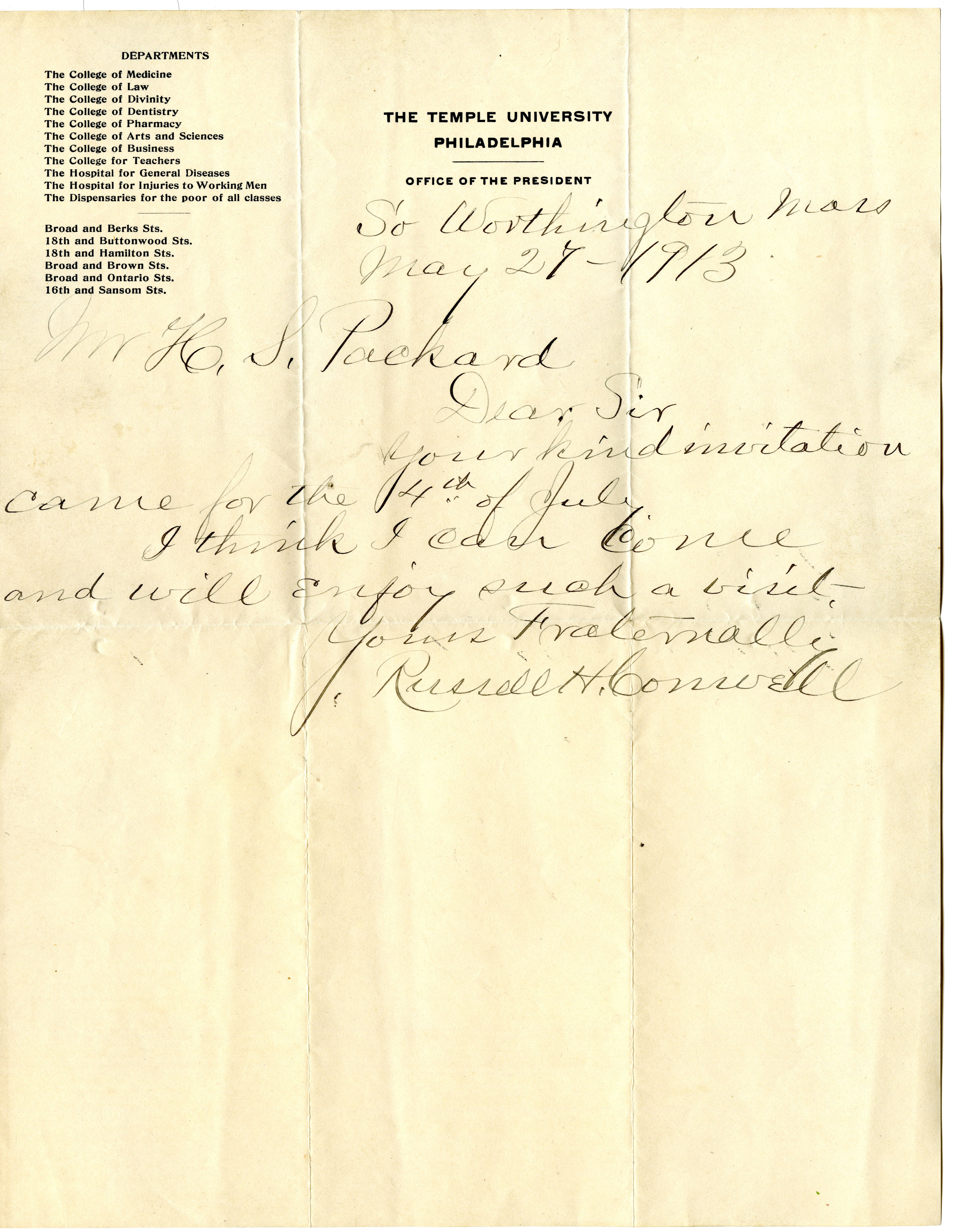 Letter on Temple University Letterhead, dated So. Worthington, May 27, 1913 addressed to Mr. H. S. Packard. 'Dear Sir, Your kind invitation came for the 4th of July. I think I can come and will enjoy such a visit. Yours fraternally, Russell H. Conwell.'