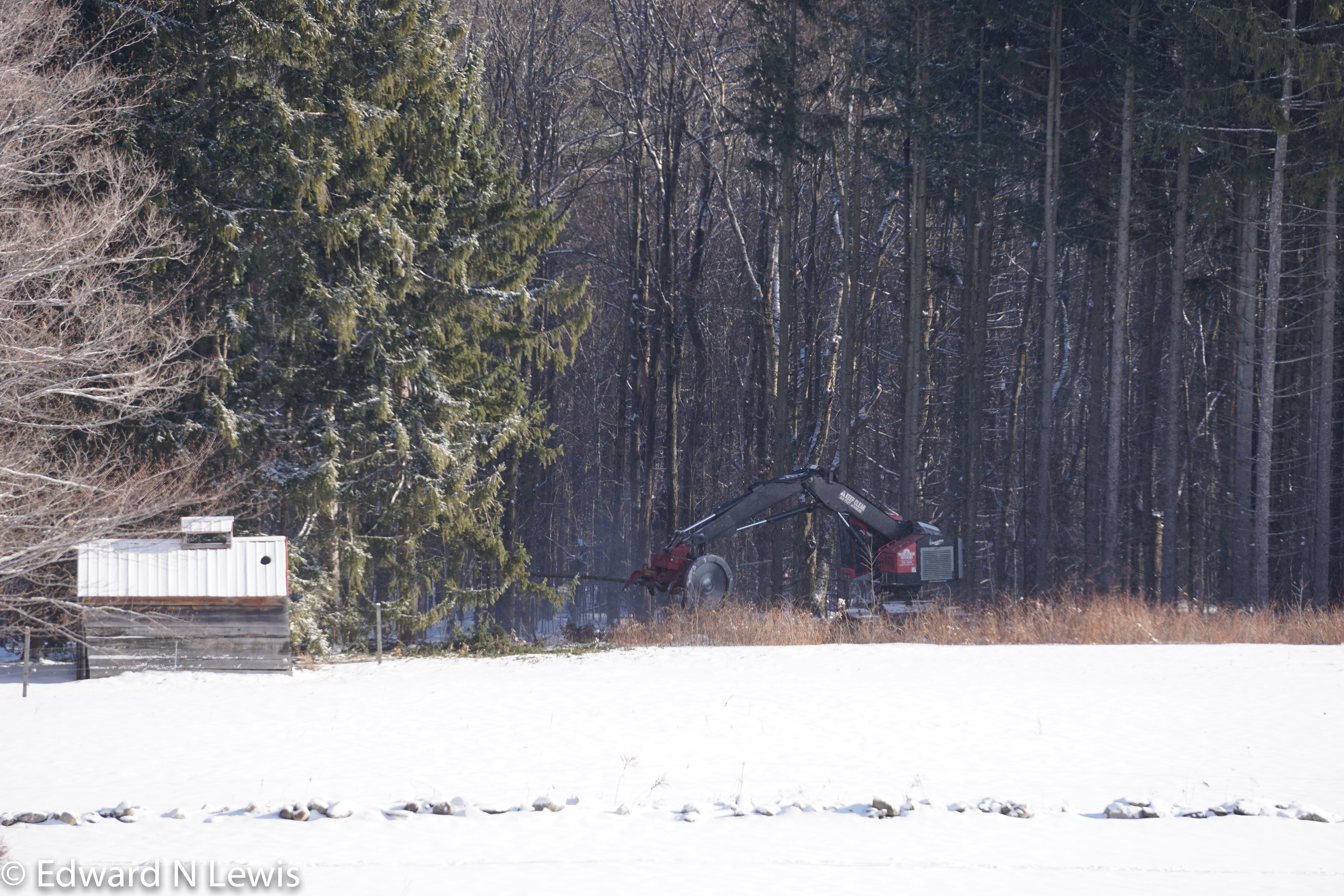 The 'feller buncher' consists of a boom, grabbing hooks and a disc. The disc has teeth that are about 1-in x 1-in x 1-in, far larger (as expected) than a chainsaw. The hydraulically-driven disc is visible at the end of the boom. The operator just finished laying down a tree that is not visible in this photo.