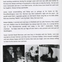 Brief account of the family of Louis Dodge and June Parish Dodge prepared for Worthington's 250th celebration. Menioned are James Dodge, Susan Dodge Morrison, Robert Dodge (wife Florence) and Norman Dodge. Also mentioned are Rob Cudworth and Ernest Fairman.