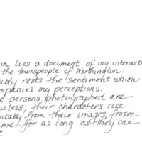 Photographs of townspeople taken by Lyn Horton in 1986. Accompanying the photos, which are mounted on cardboard (11" x 14"), is her statement: "Herein lies a document of my interaction with thew townspeople of Worthington. Invisibly rests the sentiment which accompanies my perceptions. Those persons photographed are nameless; their characters rise inimitably from their images frozen in time for as long as they can last. all under 2025-068. a: Helen Magargal; b: Lunchtime at Conwell School c: Peg DeMott; d: Ben DeMott e: Julia Sharron, Stephen Kulik, Tony Lake (Finance Committee Chairperson); f: Rob Bartlett; g: Howard Mollison; h: Bert Nugent and Donald Newton; i: Andy Burr and Harriet Burr; j. Nina Pruner; k: Peter McLean; l.: Dan and Becky Okrent; m: Charley Sawyer; n. Steve Strom; o: Tom Quinn; p. Town Meeting: Cath Whitcomb, Joyce Mollison; and Susan Kulik q: Children at Denworth Farm; r: Hank Livingston and Michael Donovan; s: Town Metting: Topic School Budget, John Morris, Donald Bridgeman; t: Town Meeting, Jenny Fairman, Esther Kerley; u: Kate WhitcomThe Grangers, Crystal Donovan, John Reagan; x: Lester Champion; y: Harbvey and Tracy and their truck on Harvey Road; z: The Zemmers and Janet Dimock; aa: David Saeyer and Bert Nugent; bb: Field Day at Conwell School, getting organized Field Say at Conwell School, relay event; ff: Town Meeting, Darlene Millman hh: